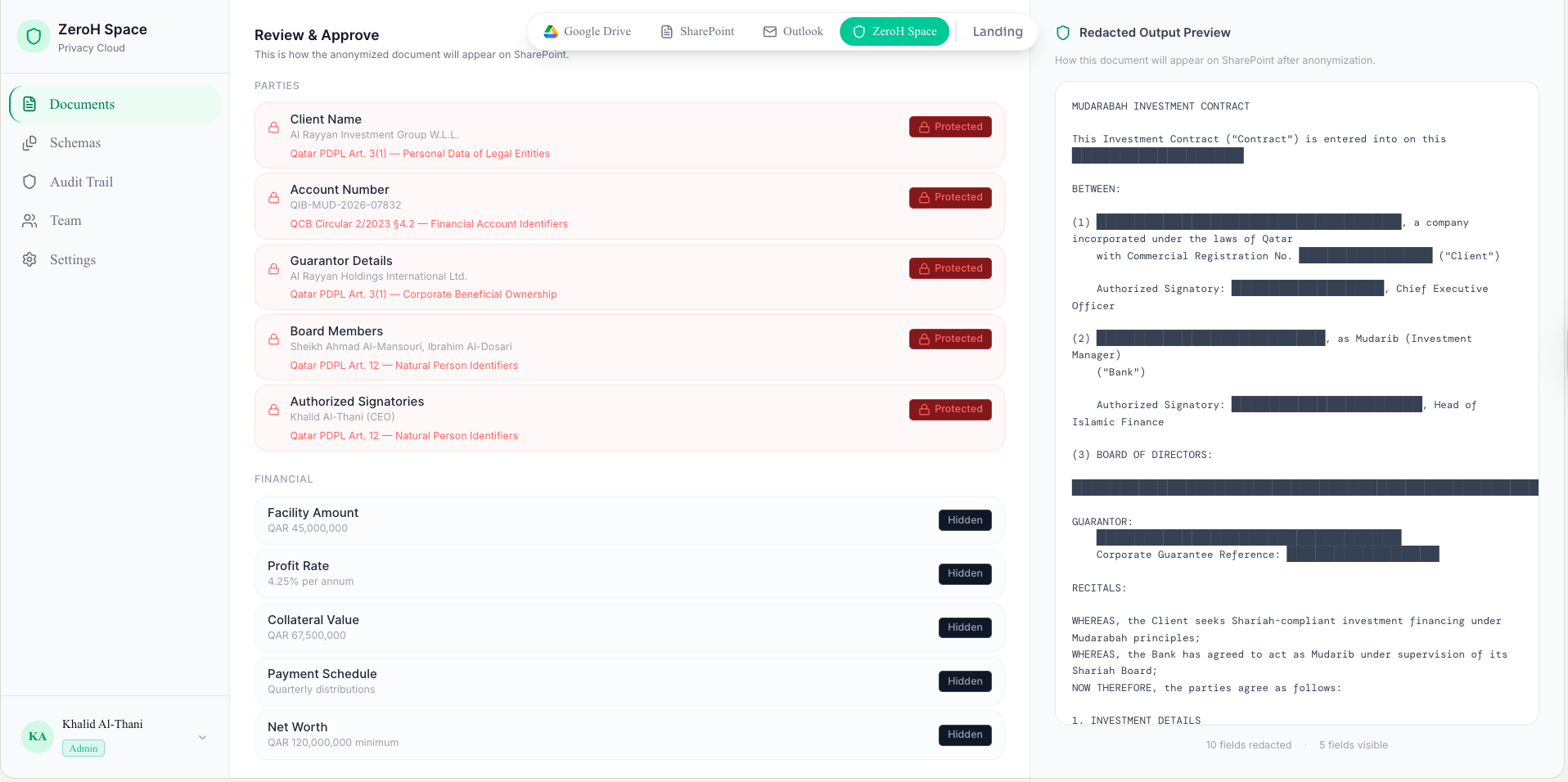 Sensitive documents are stored on-site or on-soil. Original files are kept on Qatar IPFS nodes. Only cryptographically redacted versions are uploaded to cloud providers. Data sovereignty preserved by architecture, not policy.